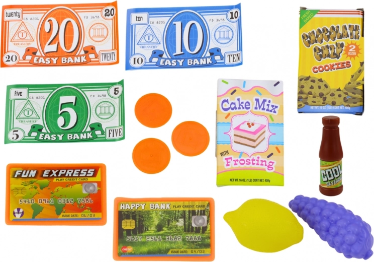 Das Set enthält eine Kasse, die den Einkaufsprozess simuliert. Die Kasse ist mit einem digitalen Display ausgestattet, das mathematische Aufgaben wie Addition und Subtraktion unterstützt, wodurch es nicht nur unterhaltsam, sondern auch bildungsfördernd für Kinder ist.