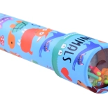 Durch Drehen des Tubus erzeugt das Kaleidoskop immer neue bunte, symmetrische Bilder, die Neugier und Fantasie der Kinder anregen.