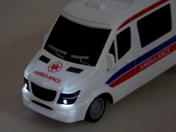 Dieses Krankenwagenmodell überzeugt mit einem realistischen Design, einschließlich Details wie Fenstern, Türen und medizinischen Symbolen an den Seiten.