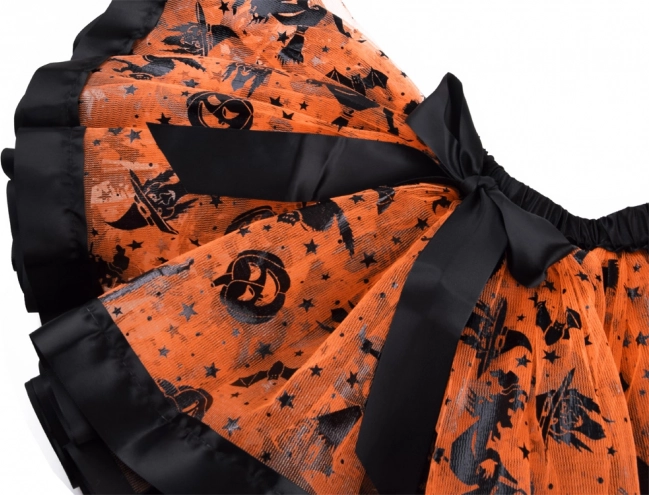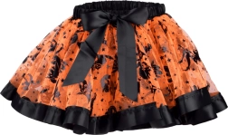 Leichter orangefarbener Rock mit schwarzer Einfassung und Prints von Kürbissen, Katzen, Hexen und Sternen betont jede Bewegung.