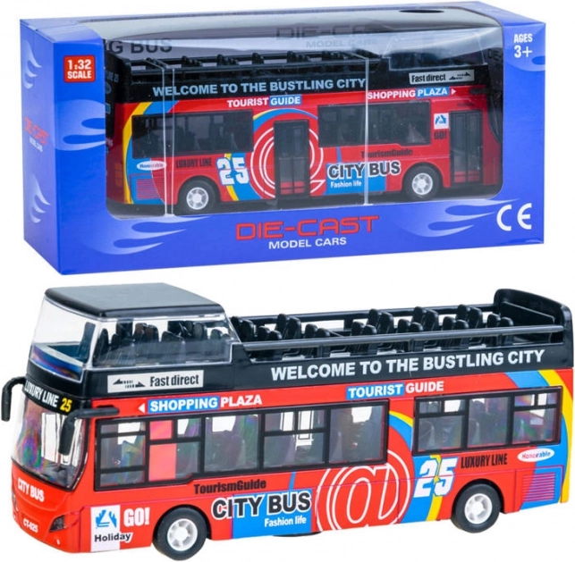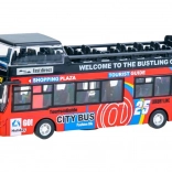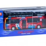 Realistischer Metall-Doppeldeckerbus mit aufschiebbaren Türen, Licht und Sound begeistert jeden kleinen Fahrer. Er verfügt über einen Friktionsantrieb (Pull-Back), Lichteffekte, Motor-, Fahr- und Hupgeräusche sowie eine robuste Metall-Kunststoff-Konstruktion.