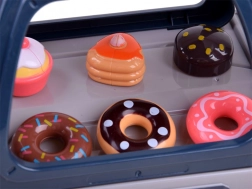 Dieses realistische Set ermöglicht Kindern, ihr eigenes Café zu eröffnen: Sie bereiten „Espresso“ zu, stellen Leckereien in die Vitrine und tippen die Bestellung an der Kasse ein. Die Kaffeemaschine mit Wasserfluss „brüht“ nach dem Einfüllen von Wasser oben und dem Einsetzen des Siebträgers Kaffee mit Lichtsignal (rot während der Zubereitung, grün nach Abschluss) sowie Mahl- und Ausgießgeräuschen. Die Kasse hat ein Drehpanel, piept bei Kartenzahlung und gibt beim Öffnen einen Ton ab.