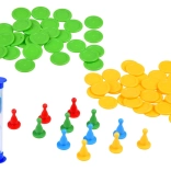 Spielregeln:Das Spiel beginnt mit dem Zusammenbau des Spielbretts in der Mitte des Spielbereichs. Anschließend werden die Karten je nach Anzahl der Teilnehmer verteilt: 2 Personen – 8 Karten pro Spieler, 3 Personen – 6 Karten pro Spieler, 4 Personen – 5 Karten pro Spieler. Die Karten bleiben mit der Bildseite nach unten liegen und dürfen nicht angesehen werden. Jeder Spieler erhält 3 Figuren zum Markieren gefundener Elemente, und es wird eine Person bestimmt, die nach jeder Runde die Chips austeilt.