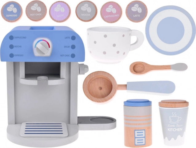 Beinhaltet Kaffeemaschine, Tasse, Löffel, Untertasse, Reisebecher, Zuckerdose und sechs Arten von Kaffee-Kapseln für realistisches und packendes Spiel.