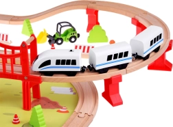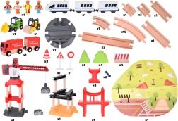 Die Einzigartigkeit dieses Sets liegt im funktionellen Kran und elektrischen Zug, der Vor- und Rückwärtsfahren ermöglicht. Im Paket sind auch Figuren von Menschen, Verkehrsschilder, Büsche und Teile für den Bau einer Brücke und weiterer Konstruktionen. Die meisten Teile sind präzise aus sicher lackiertem Holz mit schönen natürlichen Tönen gefertigt.