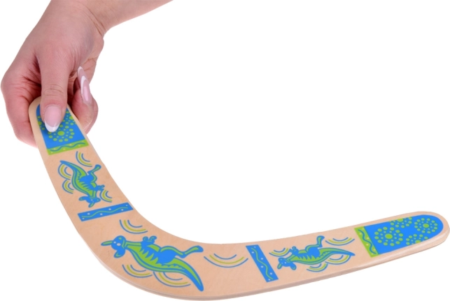 Der Holz-Bumerang ist von australischer Tradition inspiriert und für modernes Freizeitspiel angepasst. Sein ausgewogenes Profil und die richtige Rotation ermöglichen bei korrektem Wurf die Rückkehr zum Werfenden. Farbige Drucke mit Känguru-Motiven verleihen Stil und erhöhen die Sichtbarkeit in der Luft.