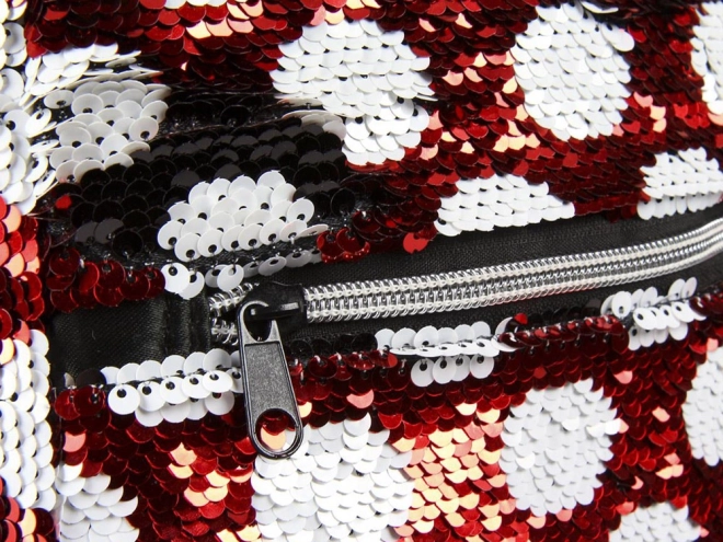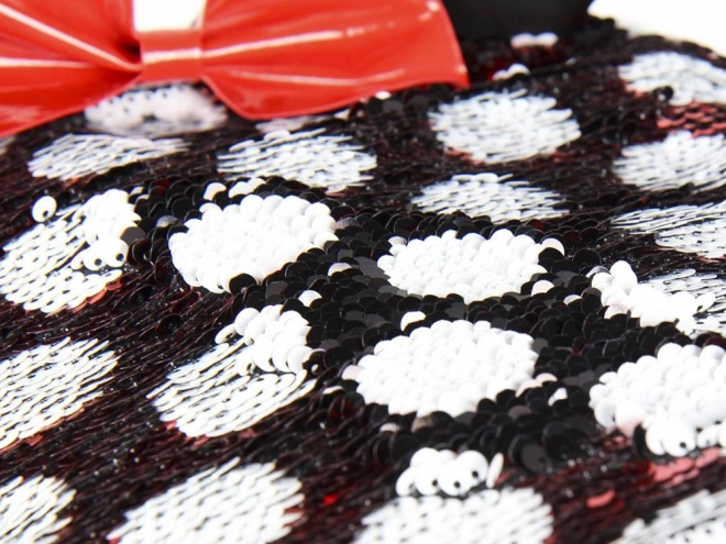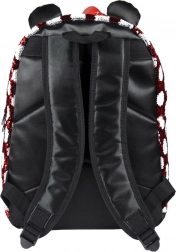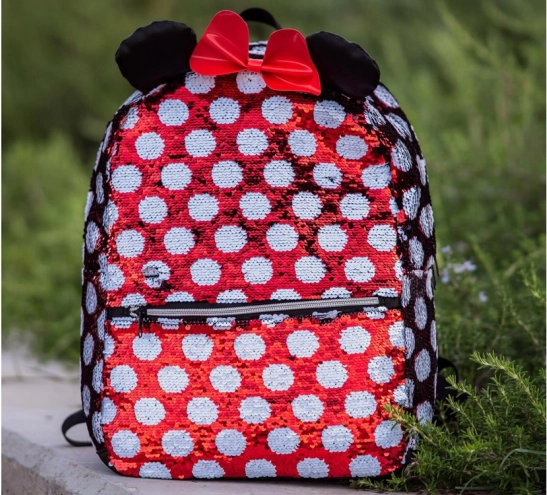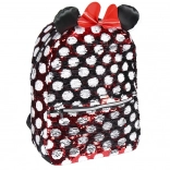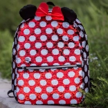 Der Rucksack mit dem charakteristischen Minnie-Muster in Rot-Weiß mit Polka-Dots, verziert mit roter Schleife und glitzernden Ohren, ist wahrhaft zauberhaft.