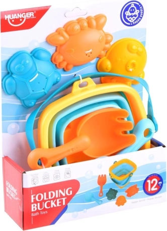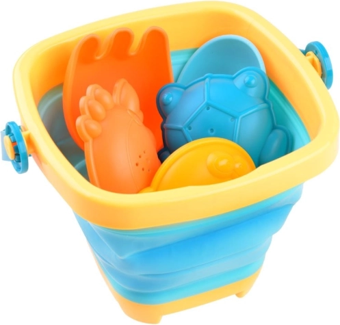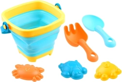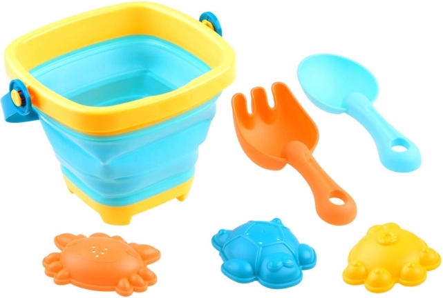 Es enthält alles, was Kinder für kreatives Spielen im Sand benötigen: faltbarer Eimer, Schaufel, Rechen und drei Förmchen.