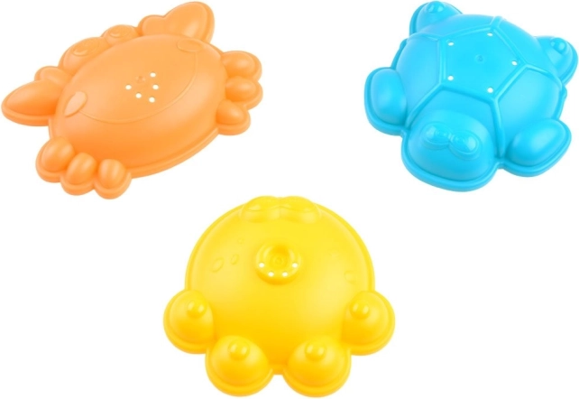 Drei Förmchen mit Krabben-, Schildkröten- und Tintenfischmotiven sorgen für viel Spaß. Jedes hat Löcher für eine einfache Sandfreigabe.