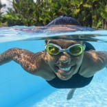 Polycarbonatgläser mit UV-Filter schützen die Augen vor Sonne, und die Antibeschlag-Beschichtung sorgt für klare Unterwassersicht.