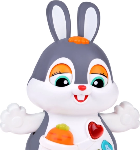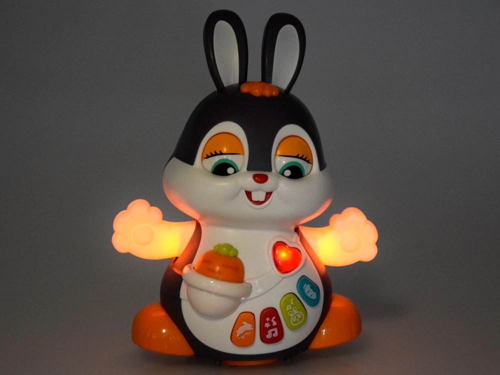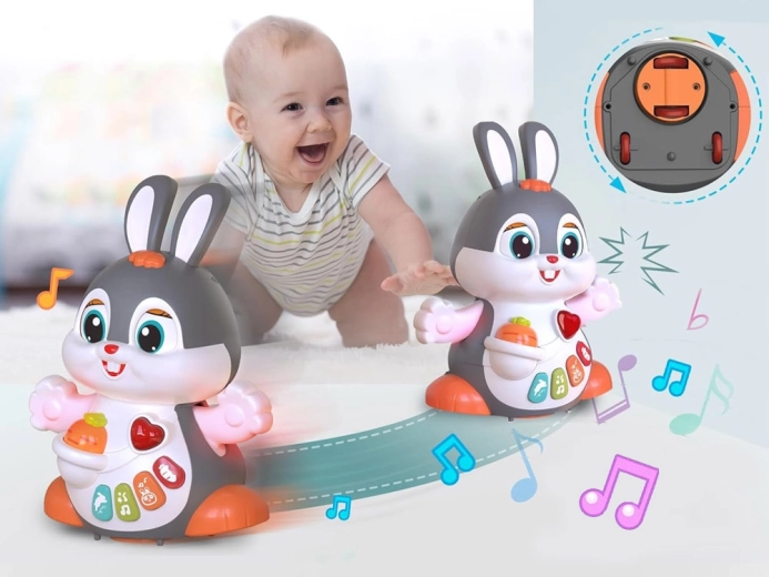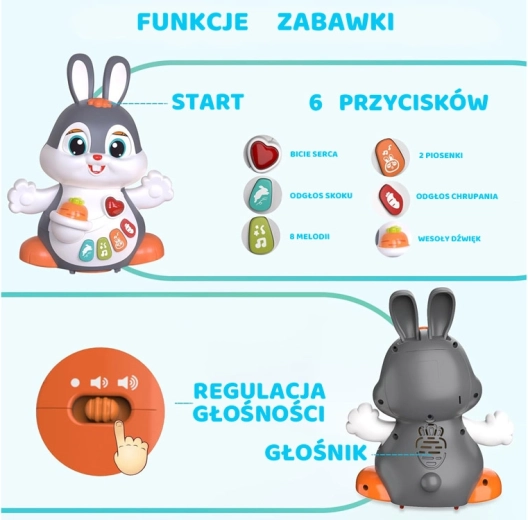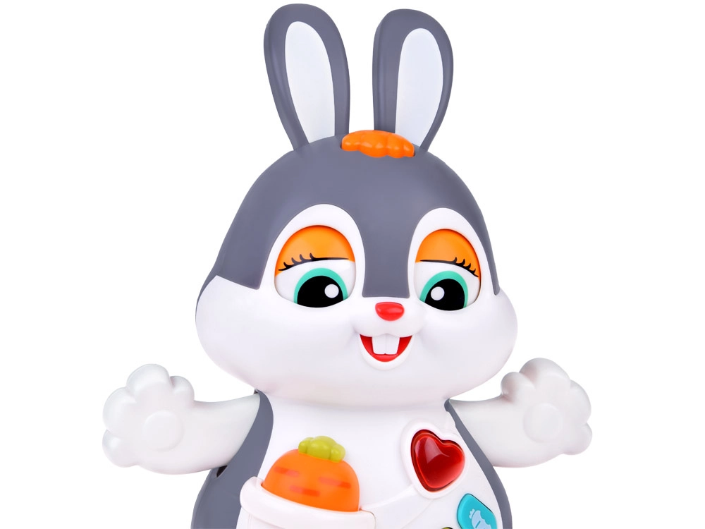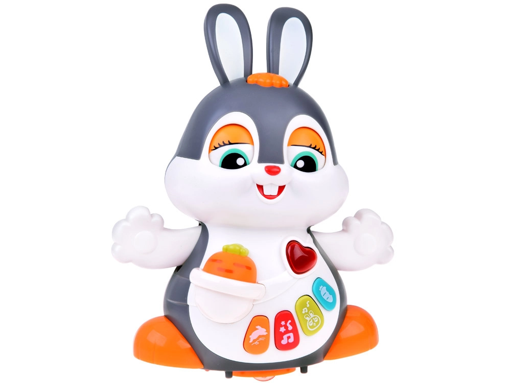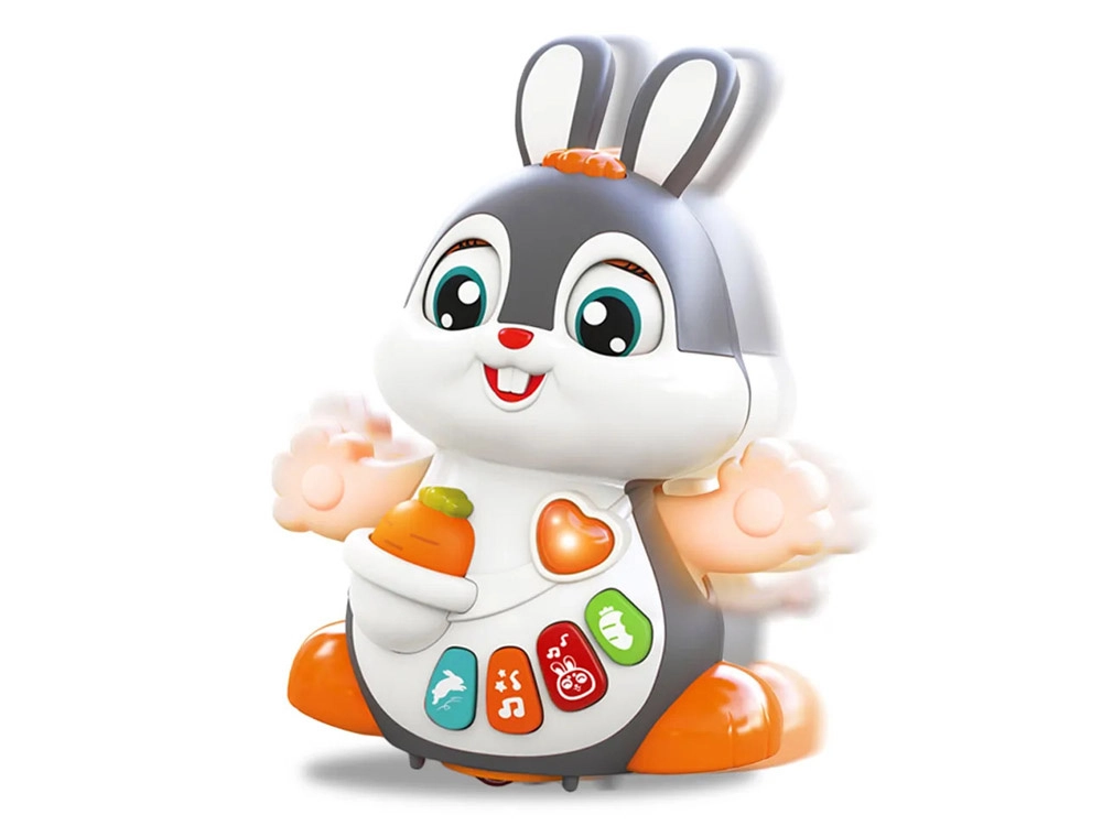 Das interaktive tanzende Häschen ist ein großartiger Begleiter für die ersten Schritte und das Krabbeln. Das Spielzeug kann sich bewegen, blinzelt mit den Augen und leuchtet im Takt der Musik. Bunte Tasten mit verschiedenen Funktionen faszinieren Kinder: Melodien, Herzschlag, Hüpfen oder das Knabbern an einer Möhre – alles begleitet von Lichteffekten.