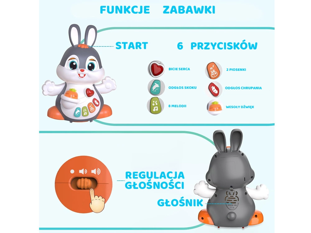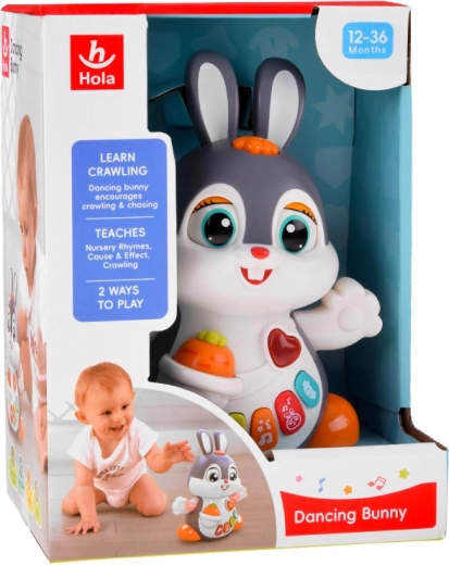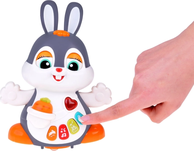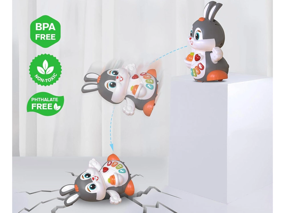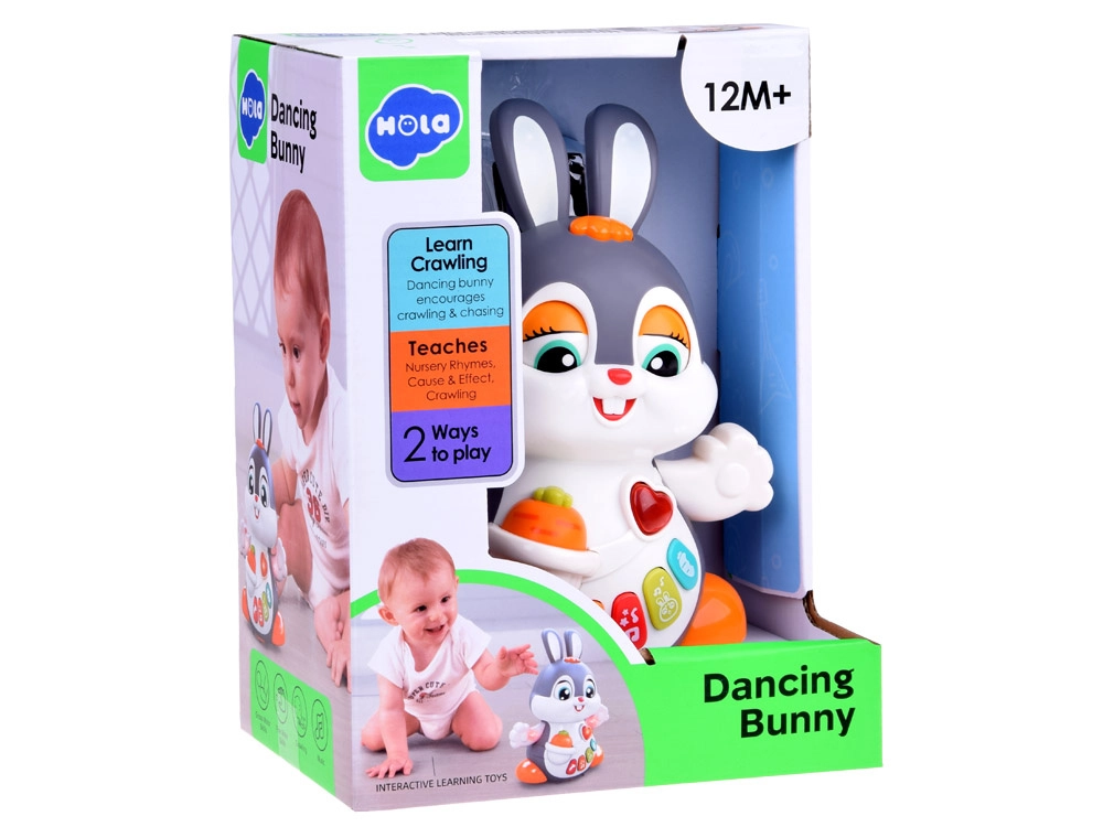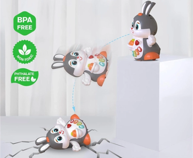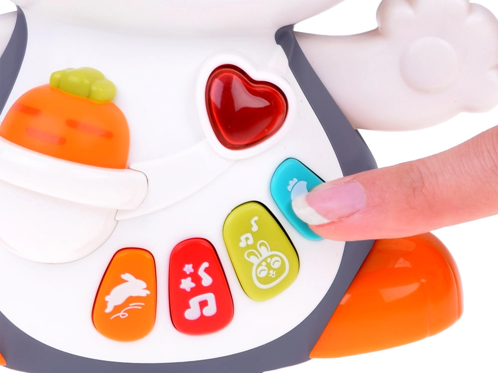 Das interaktive tanzende Häschen ist ein großartiger Begleiter für die ersten Schritte und das Krabbeln. Das Spielzeug kann sich bewegen, blinzelt mit den Augen und leuchtet im Takt der Musik. Bunte Tasten mit verschiedenen Funktionen faszinieren Kinder: Melodien, Herzschlag, Hüpfen oder das Knabbern an einer Möhre – alles begleitet von Lichteffekten.