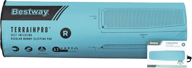 Suchen Sie eine zuverlässige Isomatte fürs Camping und Outdoor-Touren? Die BESTWAY TerrainPro ist eine selbstaufblasende Isomatte, die eine hohe Isolationsleistung (R-Wert 4,7), eine komfortable Stärke von 5,1 cm und eine robuste Konstruktion aus ToughLite und 70D Ripstop-Nylon kombiniert. Sie bietet eine stabile Körperabstützung, isoliert hervorragend gegen Bodenkälte und ist kompatibel mit gängigen Mumienschlafsäcken.