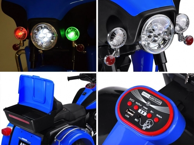 Dieses stilvolle Motorrad verfügt über leuchtend bunte Lichter vorne, einen abschließbaren Koffer für Schätze und Windschutzscheiben. Dank der Batteriestandsanzeige können Sie problemlos Ausflüge mit Ihrem Kind planen. Der Musikpanel sorgt für zusätzlichen Fahrspaß, da das Kind lustige Musik hören oder eigene Geräte anschließen kann.