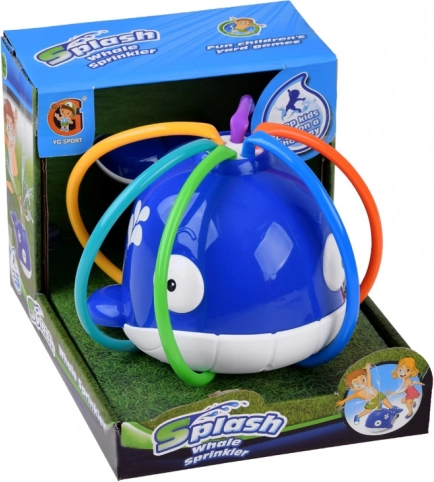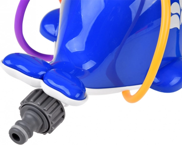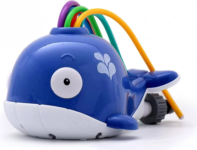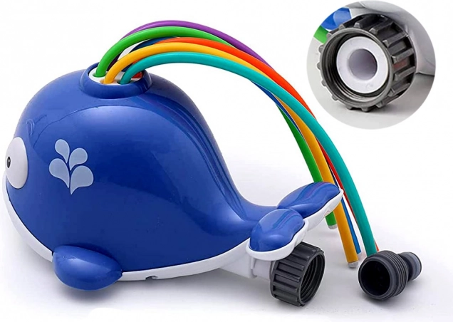 Verspielter blauer Walsprinkler mit farbigen, flexiblen Düsen, der den Garten in einen erfrischenden Wasserspielplatz verwandelt. Einfach an eine normale Gartenwasserschlauch anschließen und jede Menge Lachen, Bewegung und Spaß an heißen Sommertagen genießen. Einfache Installation und Möglichkeit, die Sprühstärke über den Wasserhahn zu regulieren.