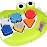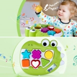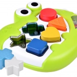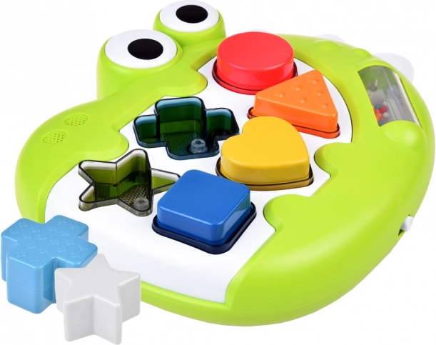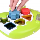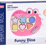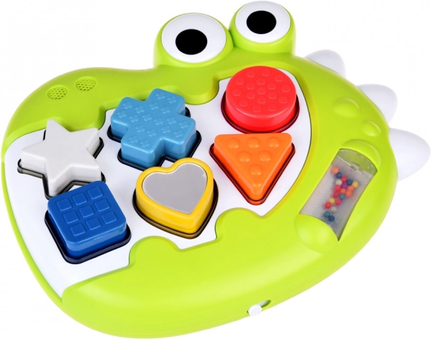 Dieser lächelnde Dinosaurier besitzt verschiedene Formöffnungen: Dreieck, Quadrat, Kreis, Herz, Stern und Kreuz, in die das Kind die passenden Teile einsetzen muss. Jedes Teil hat eine andere Farbe und Textur, was das Spiel sinnlich interessant macht. Einige der Teile enthalten Perlen, die beim Schütteln Geräusche machen.