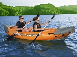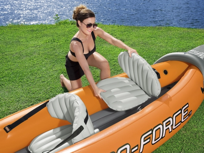 Das Kajak bietet ausreichend Platz für zwei Personen und verfügt über bequeme aufblasbare Sitze mit Rückenlehnen für ein tolles Fahrerlebnis.