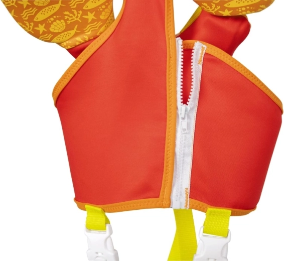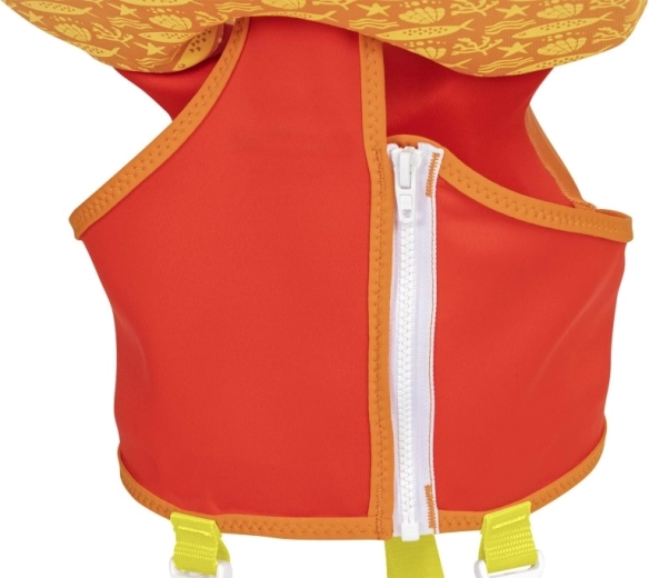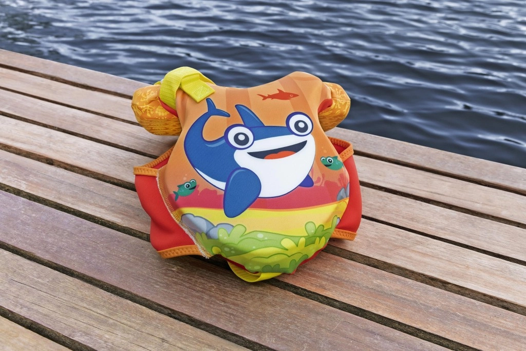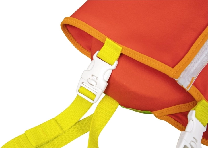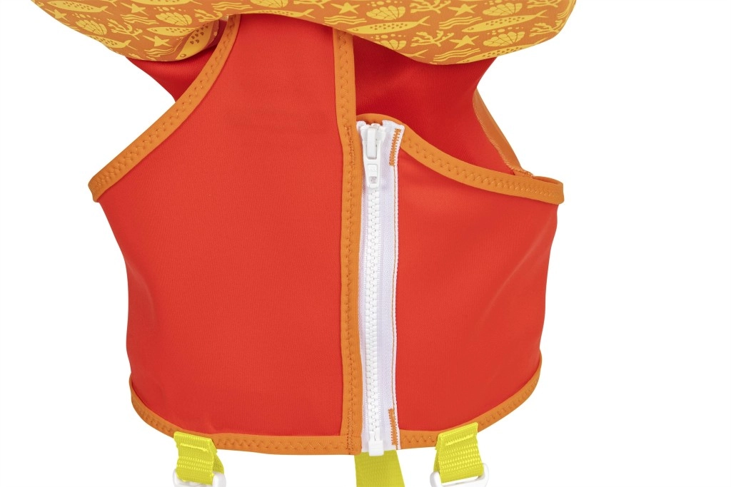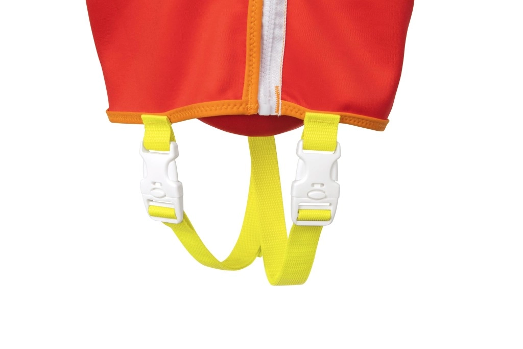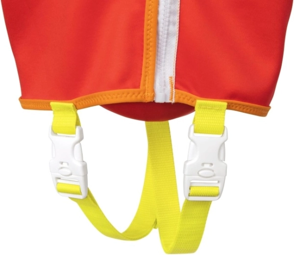 Die große Kopfstütze hilft, den Kopf des Kindes über Wasser zu halten; verstellbare Gurte mit Schnellverschlussschnallen und ein Schrittgurt gewährleisten einen festen und sicheren Sitz. Ein praktischer hinterer Griff ermöglicht es, das Kind leicht festzuhalten oder schnell aus dem Wasser zu heben.