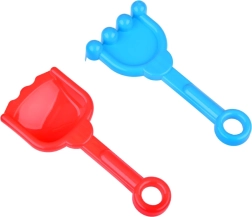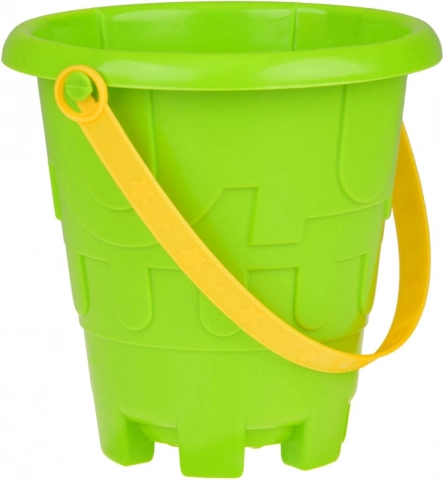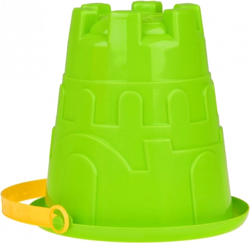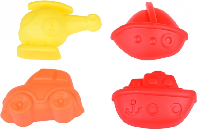 Im Set finden Sie einen Eimer, eine Gießkanne, eine Schaufel, eine Harke und 4 glatte Formen in Gestalt eines Hubschraubers, eines Autos, eines Segelbootes und eines Dampfschiffs.