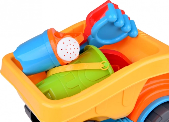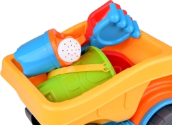 Dieses große Sandspielset mit Kipplaster ist ideal für kleine Baumeister. Kinder können Sand, Wasser und Spielzeug in der geräumigen Mulde transportieren und mithilfe der farbigen Formen Burgen und Figuren gestalten. Enthalten sind außerdem ein Eimer, eine Gießkanne, eine Schaufel und eine Harke – alles für perfekten Spaß im Freien und im Wasser.