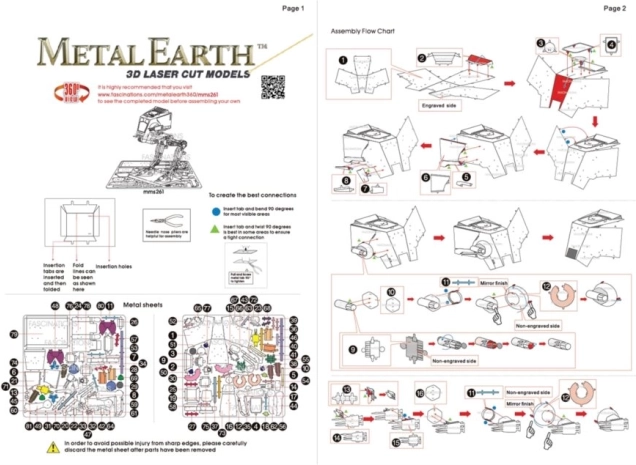 Entnehmen Sie die einzelnen Teile aus den Metallblechen; bei Bedarf verwenden Sie einen kleinen Seitenschneider (nicht enthalten). Die Teile werden mithilfe von Laschen (Haken) und Öffnungen miteinander verbunden. Biegen Sie die Laschen mit einer kleinen, feinen Zange (nicht enthalten) um und verbinden Sie nach und nach alle Verriegelungen, bis ein sehr realistisches Meisterstück entsteht!