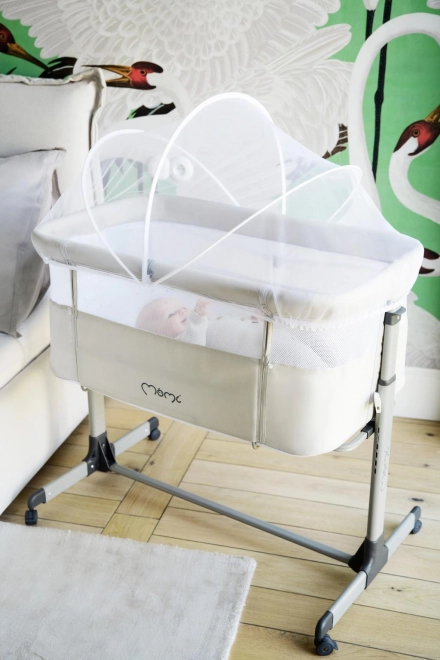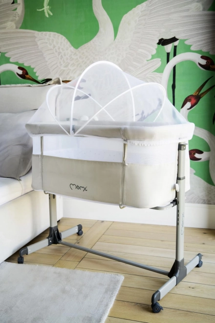 - Das Kinderbett MoMi REVO ist außerdem mit Rollen ausgestattet, damit Sie es bei Bedarf leicht verschieben können. Die Rollen verfügen über eine Feststellbremse, die Stabilität gewährleistet, wenn das Bett als Beistellbett dient.