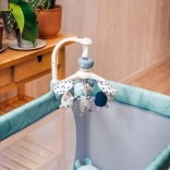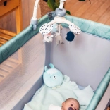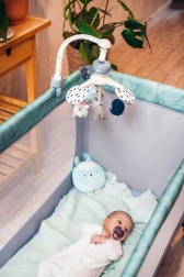 Befestigen Sie das Mobile über dem Kinderbett mit einer Klemme oder am Kinderwagen und an der Babyschale mittels Klettband. Eine Lösung für zu Hause und unterwegs.