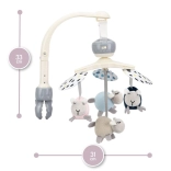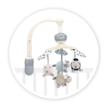 Enthalten sind weiche sensorische Spielzeuge aus hochwertigen Textilien (Samt, Filz) mit Knister- und Quietsche-Elementen. Die Spielzeuge lassen sich leicht abnehmen und separat verwenden oder in der Waschmaschine waschen. Die langsame Rotation fördert die visuelle Wahrnehmung und Konzentration des Babys.