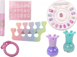 Tipp-Palette, 2 Zehentrenner, Haargummi, Sticker, 2 Lacke, Nagelfeile und Lipgloss – ein kompletter Mini-Salon in einer einzigen Verpackung.