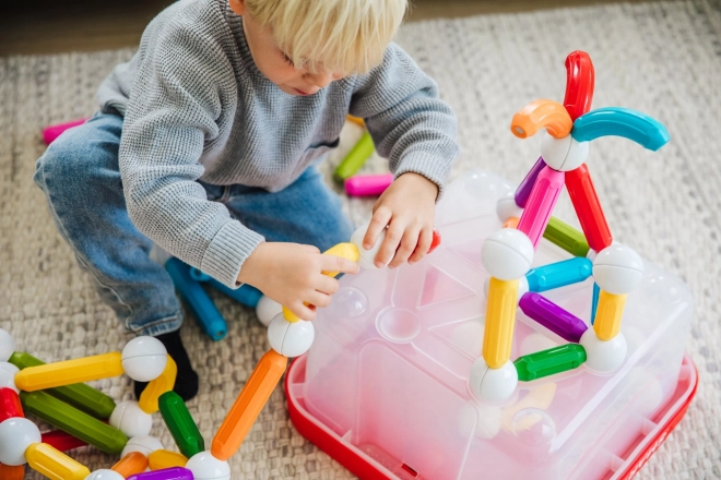 Der SmartMax-Container mit 100 magnetischen Bauteilen ist ideal zum Bauen wunderschöner, großer Konstruktionen. Dieses magnetische Konstruktionsset ist das ideale Spielzeug für kleine Kinder ab 1 Jahr. Aus diesem Set können Kinder wunderschöne Bauwerke, Brücken u. Ä. errichten. Es eignet sich auch ideal für Spielecken und Kindergärten. Das Konstruktionsset ist in einem praktischen Container untergebracht. Der rote Deckel und der Boden des Containers dienen gleichzeitig als Grundplatten für die Bauwerke.