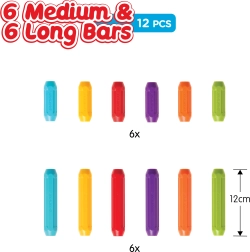Das Set enthält Stäbe in verschiedenen Farben, die die Kreativität fördern und das Bauen auffälliger, farbenfroher Konstruktionen ermöglichen.