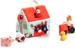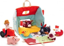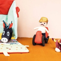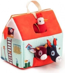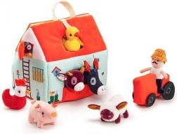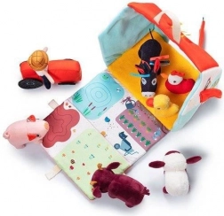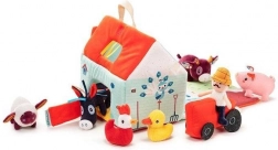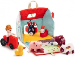 Dieses Textil-Set macht jeden Tag zu einem Abenteuer auf dem Bauernhof. Das bunte Haus–Scheune lässt sich zu einem ländlichen Gehege mit Aufdruck von Beeten, Weide, Teich und einer Schlammpfütze für das Schwein ausklappen. Enthalten sind der bärtige Bauer Jeff, der rote Traktor und die Tiere: Kuh Rosalie, Schwein Simon, Schaf Yvon, Enterich Gaston, Henne Paulette und Esel Ignace. Alles ist aus weichen Materialien mit verschiedenen Strukturen für die Sinneswahrnehmung gefertigt.