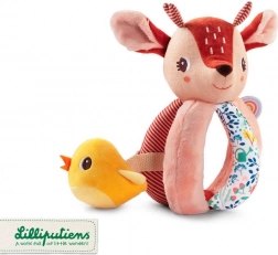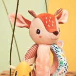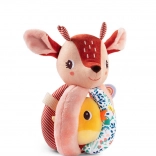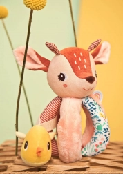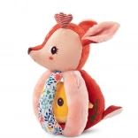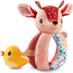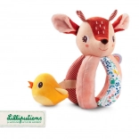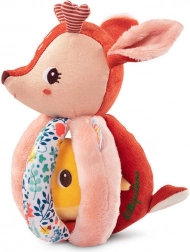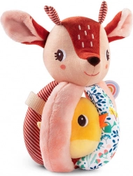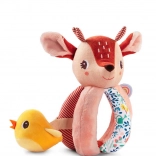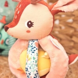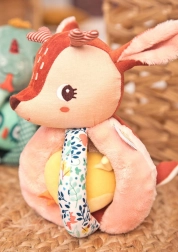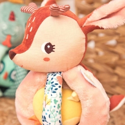 Originelle, superweiche Rassel, die von kleinen Kinderhänden leicht gegriffen werden kann. Rehkitz Stella passt sorgfältig auf den kleinen gelben Vogel auf. Die Rassel bietet Kindern eine Mischung aus verschiedenen Texturen und Aktivitäten zum Entdecken. Klang eines eingenähten Glöckchens, knisterndes Papier, versteckter Vogel.