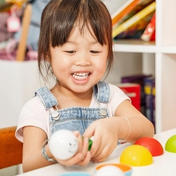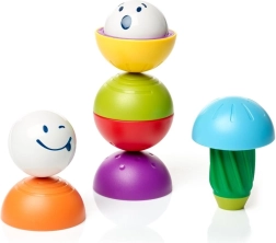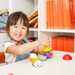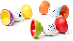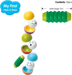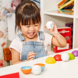 Fröhliche Gesichter und leuchtende Farben motivieren Kinder zum Bauen, Sortieren und zum Versteckspiel mit den Kugeln.