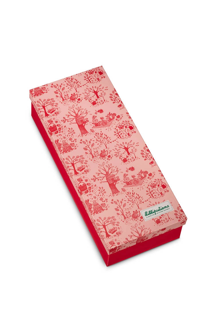 Stabile, dekorative Box mit Druck passend zum Kleid der Puppe – schön als Verpackung und praktischer Aufbewahrungsbehälter.