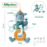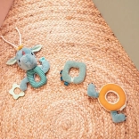 Jedes Element besteht aus einem anderen Stoff (z. B. Cord, weiches „Fellchen“ und weitere Texturen), ein Bein knistert beim Reiben. Die Kette lässt sich mit den Bändern am Kopf leicht am Kinderwagen, Autositz oder Tragetuch befestigen, um dem Baby das Reisen zu versüßen. Das Spielzeug ist sorgfältig verarbeitet, sicher und unterstützt die Feinmotorik (Greifen, Schütteln, Öffnen/Schließen, Reiben) sowie die sensorische Entwicklung (akustische und taktile Reize).