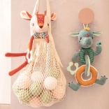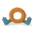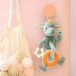 Verschiedene Materialien (Cord, weiches Fell u. a.) fördern den Tastsinn, und die Bänder am Kopf sorgen für eine einfache und feste Befestigung am Kinderwagen oder Autositz.