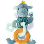 Die Lilliputiens-Sensorikkette mit dem Motiv Drache Joe besteht aus drei weichen Gliedern, die sich dank des mittleren Rings mit Magnetverschluss trennen und wieder verbinden lassen. Im Kopf ist eine Rassel verborgen, eine Pfote trägt ein strukturiertes Beißteil in Sternform und die andere einen sensorischen Aufnäher. Mähne, Horn an der Schnauze, Flügel, Ohren, Bänder und kleine Krallen laden zum Entdecken ein und stimulieren den Tastsinn.