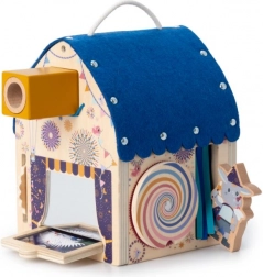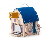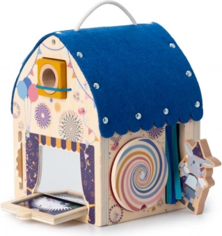 Das Häuschen ist sorgfältig aus FSC-zertifiziertem Buchen-Sperrholz und Textil-Elementen gefertigt, die dem Spiel eine vielfältige haptische Erfahrung verleihen. Die Oberfläche lässt sich einfach reinigen und ist damit für den täglichen Einsatz bereit. Ideal als pädagogisches Spielzeug zur Förderung von Sehsinn, Auge-Hand-Koordination und Konzentration.