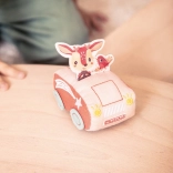 Das weiche Fahrzeug ist mit Rehkitz Stella und Vogel Robin verziert, die der Spielfreude und Attraktivität des Spielzeugs beitragen.