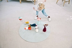 Entdecken Sie den Zauber der weichen Lilliputiens-Kegel aus der Kollektion Bauernhof. Die fröhlichen Helden – Esel Ignace, Kuh Rosalie, Schweinchen Simon, Schaf Yvon, Henne Paulette und Ente Gaston – haben einen stabilen, leicht beschwerten Boden, sodass sie sich leicht aufstellen und ebenso leicht umwerfen lassen. Dazu gehört auch ein bunter Plüschball mit Glöckchen, der zum Werfen und Rollen animiert.