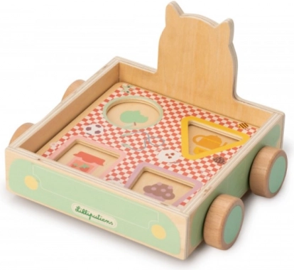 Dieser originelle Holz-Wagen mit dem Motiv des Wolfs Ludwig bietet Kindern ab 10–12 Monaten viele Aktivitäten in einem. Das Kind kann das Spielzeug ziehen, Formen in die passenden Öffnungen stecken und verschiedene Figuren sowie Farben kennenlernen. Die Kombination aus Holz und weichen Textilelementen sorgt für angenehme haptische Reize und sicheres Spiel.