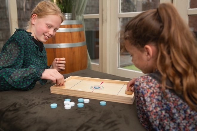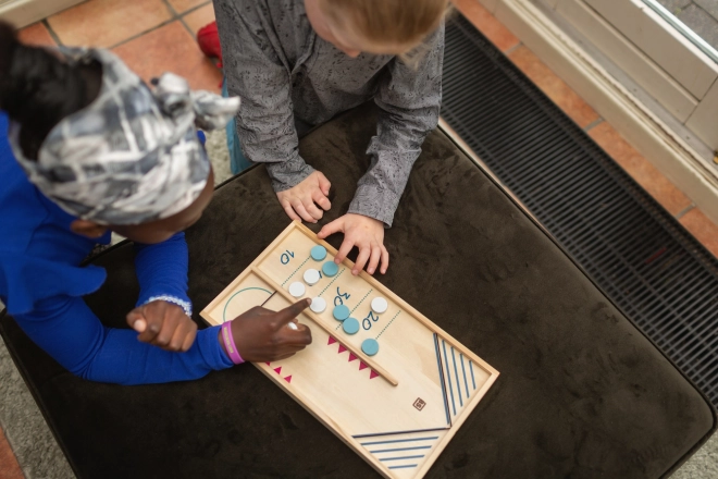 Tischhockey und Mathematikspiel für Kinder bieten doppelten Spaß! Im ersten Teil haben zwei Spieler die Aufgabe, ihre Chips auf Felder zu schießen. Im zweiten Teil treten sie im Tischhockey an, bis ein Spieler sieben Tore erreicht. Beide Spiele sind so konzipiert, dass sie die Hand-Augen-Koordination fördern und numerische Fähigkeiten entwickeln.