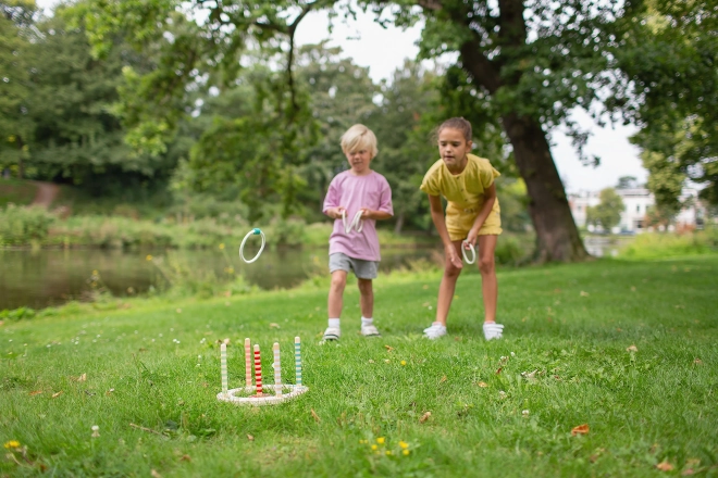 Dieses traditionelle Spiel mit einer Holzbasis und bunten Ringen ist ideal für drinnen und draußen. Teste deine Fähigkeiten beim Werfen der Ringe auf bunte Stäbe und sammle so viele Punkte wie möglich. Das Spiel ist unterhaltsam und herausfordernd, da du die Wurfdistanz anpassen kannst.