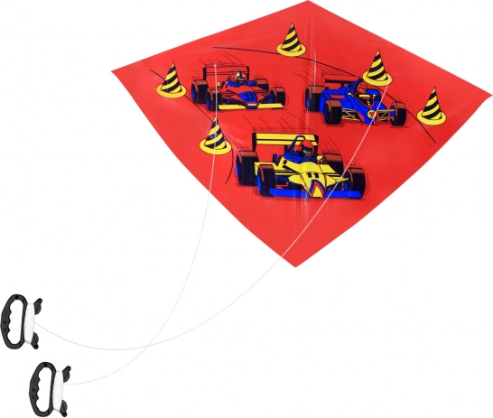 Der Drachen ist mit Rennwagen- und Verkehrskegelnmotiven verziert, was seinem Aussehen Verspieltheit und Abenteuerlust verleiht.