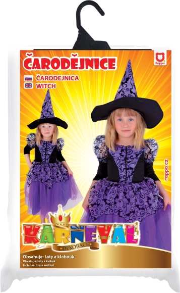 Zum Kostüm gehört ein passender Hut, der mit demselben Muster wie das Kleid verziert ist und dem Kostüm eine authentische Hexenoptik verleiht.