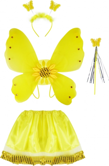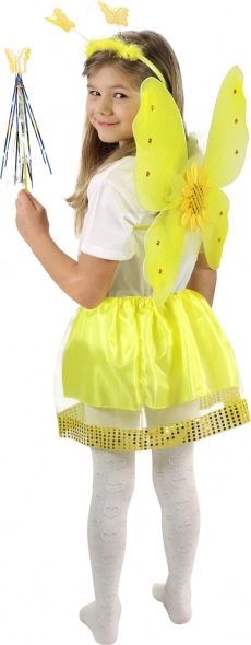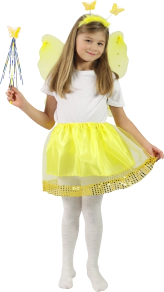 Die Flügel lassen sich dank der Schulterträger bequem tragen und der leichte Rock schränkt die Bewegung nicht ein. Der Haarreif mit metallischen Schmetterlingen und der abgestimmte Zauberstab runden den Look ab – ob für Karneval, Schulaufführungen oder fantasievolle Spiele zu Hause.