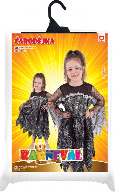 Der kontrastierende silberne Spinnennetzdruck auf dem schwarzen Kleid, der zackige Saum und die Netzärmel verleihen dem Kostüm eine authentische Hexenstimmung, die bei jedem Anlass hervorsticht.