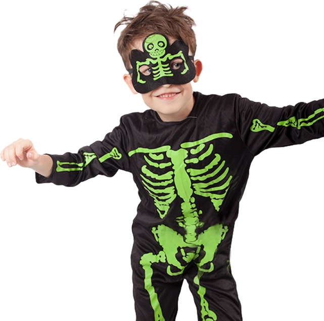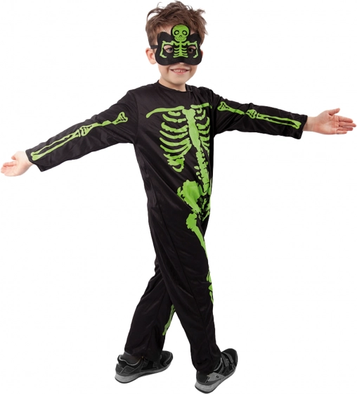 Verwandeln Sie Ihr Kind in ein bezaubernd gruseliges Skelett! Dieses Kinderkostüm mit neongrünem Knochen-Print auf einem schwarzen Overall stellt sicher, dass es auf jeder Party auffällt. Dank des leichten und angenehmen Materials trägt es sich bequem und schränkt die Bewegungsfreiheit nicht ein.