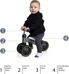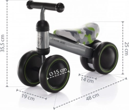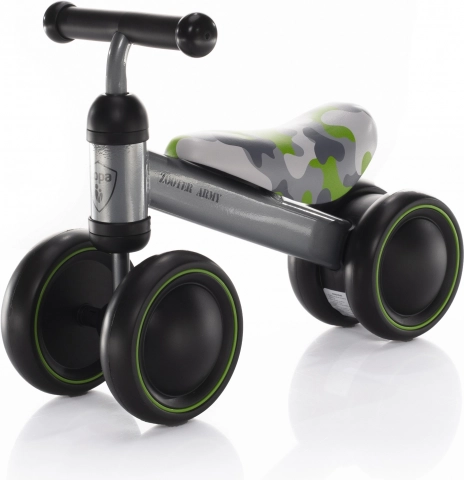 Das Laufrad für Kinder Army vereint attraktives Design mit praktischen Funktionen. Dank seines geringen Gewichts und der „silent wheels“-Technologie bietet es eine sehr leise Fahrt, was besonders Eltern zu schätzen wissen. Es ist für Kinder mit einem Gewicht von 18 bis 20 kg konzipiert und damit das ideale erste Rad für junge Fahrer.